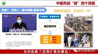 隔离人员的确诊率,在2020年2月初是80%;中药漫灌后,到2月中下降为30%,2月底下降为10%。