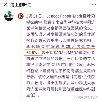 当时武汉新冠病人的死亡率非常高,2月21日的论文显示,金银潭医院重症病人28天内的死亡率高达61.5%。