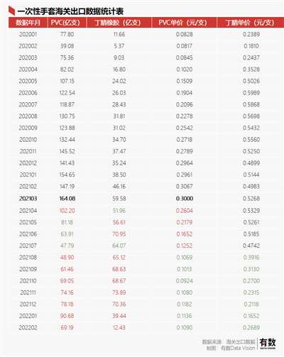疫情突然爆发,全球手套需求突发性激增,价格飞涨,出口价格在2021年3月达到巅峰,相较2020年1月,单价将近翻了三倍。