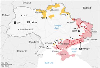 红色为俄占区,黑色及红色箭头分别为乌军和俄军进攻方向