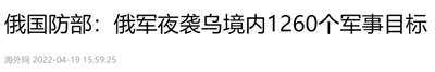 根据乌克兰国防部发布的消息,4月18日夜,俄罗斯空军对乌东顿巴斯地区发动数十次空袭,而俄罗斯国防部19日称,俄军昨夜在顿巴斯及哈尔科夫地区近500公里的前线上,用火箭弹和火炮一共攻击了乌方超过1260个军事目标。