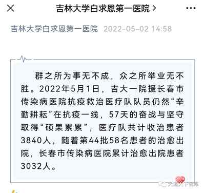 3、另一家定点医院,吉林省人民医院已经在2022年4月30日胜利闭舱了。从3月13日至4月30日,一共收治了3719名新冠病人,0死亡。