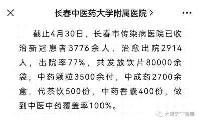 4、《吉林日报》报道,本轮疫情发生后,吉林对所有确诊病例和无症状感染者100%使用中医药治疗。