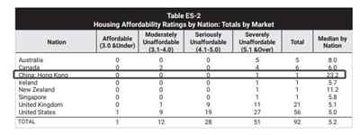 一份国际调查报告显示,2021年第三季度,全球8个国家的92个主要市场中,香港的房价对收入比率达到23.2,排名第一。