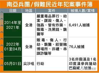 据港媒东网统计,2014年至2021年,“南亚兵团”和“假难民”在香港涉嫌抢劫、谋杀、伤人、强奸、藏有炸药、贩毒、洗黑钱、袭警等案件,共6491人被捕。