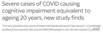 据英媒报道,剑桥大学和伦敦帝国理工学院最新研究发现,新冠重症患者认知能力的退化,等同于正常人50岁至70岁的变化。从量化的角度来说,相当于智商降低10点!