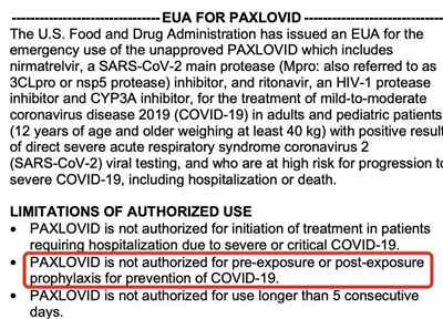 美FDA(食品药品监督管理局)去年12月22日的紧急授权中是这么写的:Paxlovid is not authorized for the pre-exposure or post-exposure prevention of COVID-19,即Paxlovid没有被授权用于暴露前或后的预防。这一原则,它们今年4月12日又重申了一次。