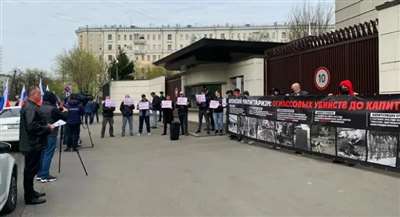 5月6日,在位于莫斯科格罗霍尔斯基巷的日本驻俄罗斯大使馆外,一群俄罗斯民众用横幅和标语牌提醒人们勿忘日本人曾犯下的罪行。