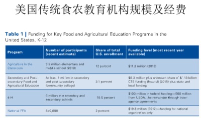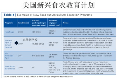 美国传统食农教育有几个主要的机构推广实施校内外的课程,包括4-H俱乐部、美国未来农夫、和“教室里的农业”计划。这三个机构都是美国农业部赞助的机构。4-H俱乐部始于1902年,所以它的食农教育历史非常之长,1911年命名为4-H俱乐部,名字来源于英文4个H打头的字,这四个H是头(head)、心(heart)、手(hand)和健康(health),似乎跟今天中国教育的四大教育目标——知识、技能、情感、价值观——遥相呼应。4-H主要由农业部资助,也接受商业和私人捐助。美国未来农夫计划成立于1929年,是一个民间资助的机构,但是也受到美国农业部的资助。它的出发点是培养农民子弟的自信心,让务农的人感到自豪。最后一个项目“教室里的农业”计划也是美国农业部支持的,始于1977年,1981年成为全国性的食农教育计划,主要目的是培养农业素养。