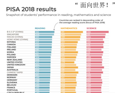 改革开放四十年,中国教育在“面向现代化,面向世界”上成绩斐然。例如,中国2018年参加欧洲经合组织(OECD)举办的PISA测试,在68个国家和地区中再登榜首。PISA每三年组织一次,对全球68个国家和地区14岁孩子进行语文、数学和科学科目的测试。自2009年上海首次参加该测试,中国在四次全球测试中三次夺冠,2018年更是在科学和数学成绩上远超排名第二的新加坡。这说明什么呢?说明我们的教育“面向世界”方面成效卓著。
