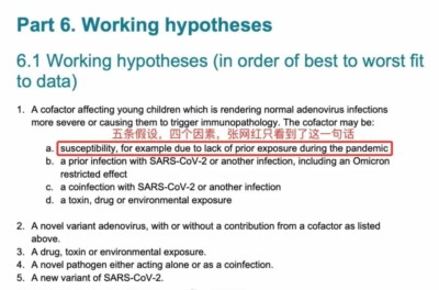 假说1:普通腺病毒感染。之所以普通腺病毒会引起如此急性重型症状,存在4种可能的共同成病因素:a. 易感性,例如疫情期间儿童缺乏对腺病毒的提前接触;b. 先前感染过新.guan或者其他感染,包括奥密克戎特有的作用;c. 与新.guan的合并感染或其他感染;d. 毒素、药物或环境暴露。