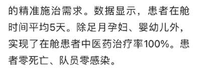 湖南日报5月6日报道的,湖南援沪中医医疗队接管上海古丹路方舱医院,自4月17日开舱以来,医疗队累计收治5209人,转诊54人,解除隔离(出院)4224人,患者零死亡,队员零感染。数据显示,除足月孕妇、婴幼儿外,实现在舱患者中医药治疗率100%,患者在舱时间平均5天。