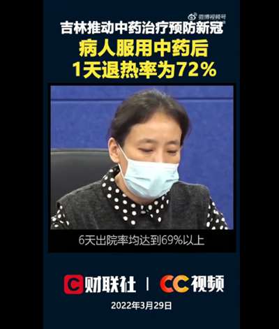 3月29日吉林省疫*情防控工作新闻发布会上,长春中医药大学附属医院肺病中心呼吸科主任仕丽讲述了长春中医药大学在应对本次新冠奥密克戎变异株疫*情的中医药预防和治疗的情况:采用纯中药治疗,病人服用中药后,1天退热率为72%,3天退热率为96%。症状消失的病人,从用药后第4天开始检测,按照间隔24小时的连续2次核酸检测阴性为出院标准,6天出院率均达到69%以上,住院时间明显缩短。