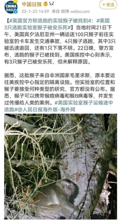 2022年1月23日,美国疾控中心运输用于研究的100只猴子的卡车发生交通事故,有4只逃跑,其中1只没找到,美国官方当时就警告:逃跑的猴子身上可能有猴痘病毒。