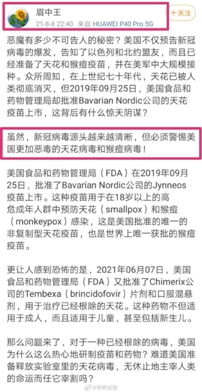 这是一位网友在2021年8月发出的预言:2019年9月25日美国突然批准了一款天花疫.苗上市,我们必须警惕美国更加恶毒的天花和猴痘病毒。