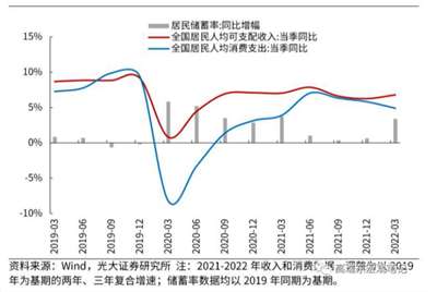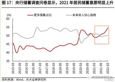 这一点反映在经济数据中就是:储蓄意愿和居民储蓄率在疫情后都处于高位,并且和疫情的爆发有较强的相关性——在 2020 年下半年到 2021 年的相对平静期间,居民储蓄率有所回落;而随着 21 年末疫情的重新反扑,储蓄率也开始处于高位。
