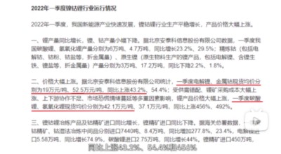 根据工信部的数据,一季度国内镍、钴、电池级碳酸锂均价分别为每吨19万元、52.5万元和42.1万元,同比上涨43.2%、54.4%和456%。