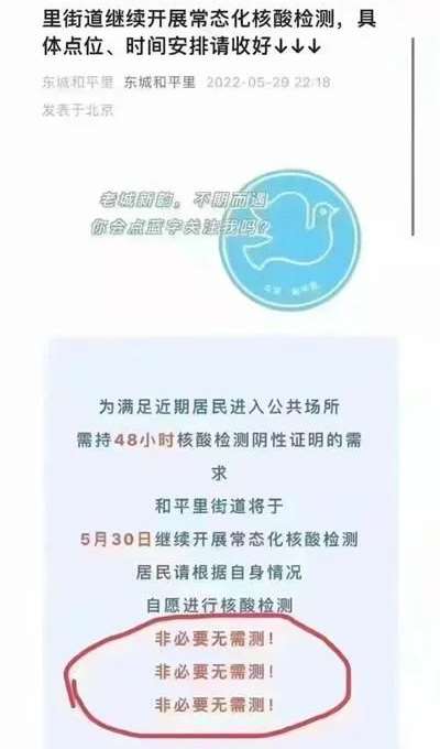 这个通知一出,好多地方已经改常态化检测为自愿检测了,北京东城区和平里街道甚至连用三个“非必要无需测”来提醒大家。