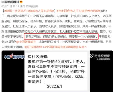 6月1日,网友反映温州平阳一小区下发了一则通知,称:“未接种第一针的60周岁以上老人,没有出具医生不能接种证明的,一律停办居保、社保年检,民政定补一律暂停发放(包括低保、优抚、重残等)”。