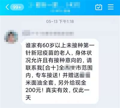 之后,学校便开始统计学生家里60岁以上老人新冠YM接种情况,还见到有人分享“老人接种有奖金有礼品”这样的信息,推进力度确实不小。