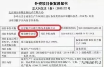 2021年2月5日,中国国家药品监督管理局批准科兴中维的新型冠状病毒灭活疫苗(Vero细胞)注册申请,其申请通知为《外资项目备案通知书》,且标注了科兴中维是“外商独资企业”。