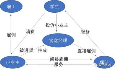 食堂中有五个群体:学生,小资产阶级小业主们,雇工,保洁人员,作为资方代表的食堂经理。食堂内部的矛盾体现在这几个群体间的相互关系上。下图展示了这几个群体间的主要相互关系。
