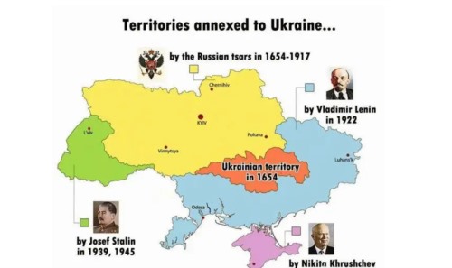 (橙色是乌克兰原本的国土,黄色是历代沙皇给的土地,浅蓝色是列宁划给乌克兰的土地,绿色是斯大林从波兰抢来给乌克兰的土地,紫色是赫鲁晓夫划给乌克兰的土地)