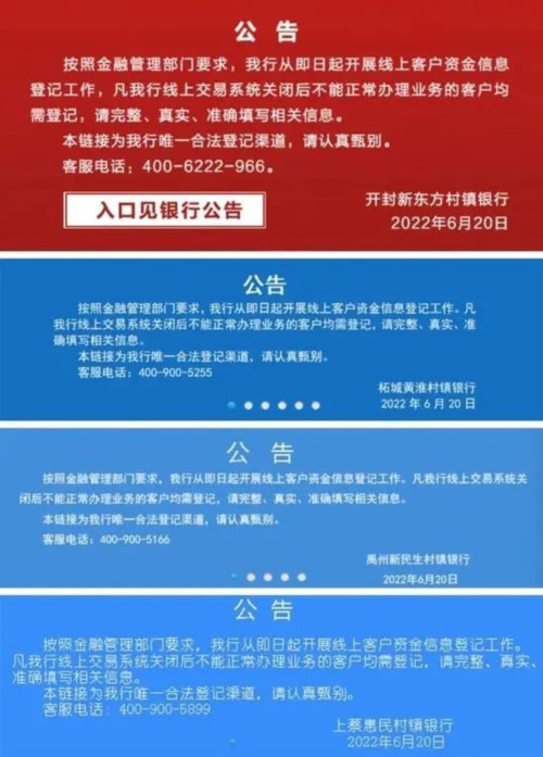沸沸扬扬了两个多月的“河南4村镇银行无法线上取款”事件有了新进展。20日上午,涉事的4家村镇银行同步发布公告表示,按照金融监管部门要求,即日起开展线上客户资金信息登记。