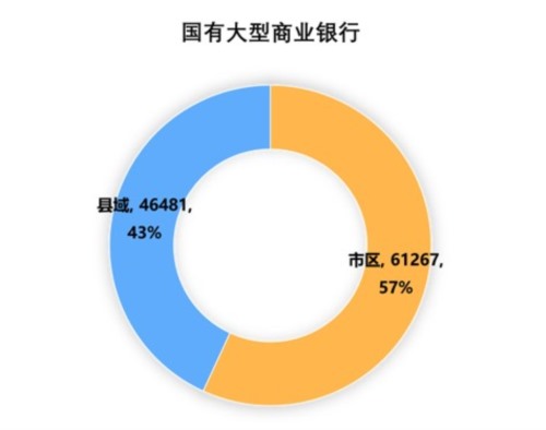 在国有大型商业银行的107748个网点中,市区地区分布有61267个,占总量的56.86%;县域地区分布有46481个,占比43.14%。整体来看,国有大型商业银行网点在市区的覆盖率更高。
