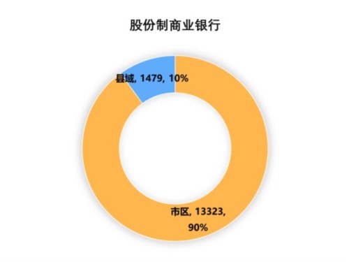 股份制商业银行也几乎放弃了农村市场,截至2019年底,股份制商业银行网点总量为14802个。其中,市区地区分布有13323个,占股份制商业银行网点总量约90%;县域地区分布有1479个,占总量不到10%。