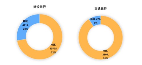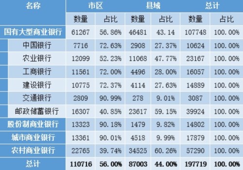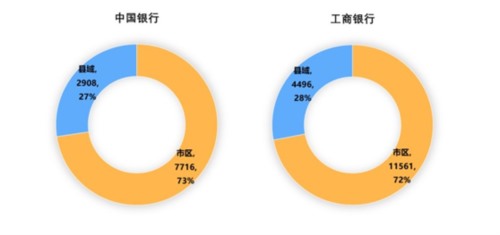 农业银行相对于其他国有大型商业银行,网点在市区和县域的分布则相对均衡。市区银行网点数量为12099个,占其网点总量约52%;县域网点数量为11068个,占比约48%,基本上五五开。