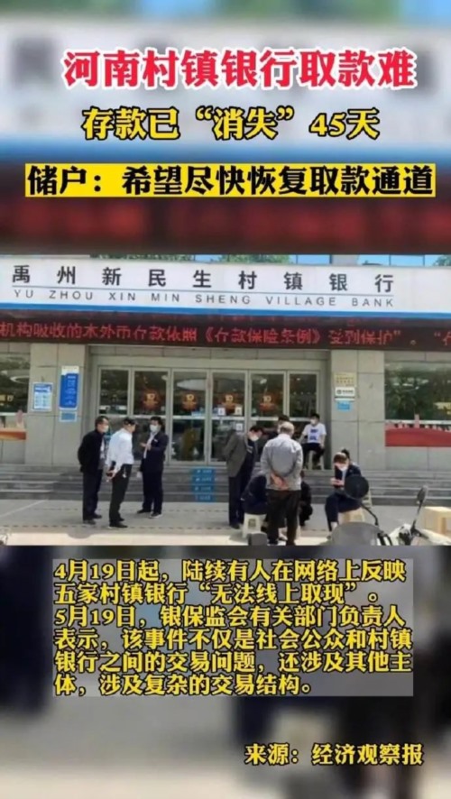 这几家村镇银行四月份就爆雷了,如果不是相关部门一番“赋红码”的骚操作吸引了全国人民的注意,被骗的储户们是不是还要继续到政府门前击鼓鸣冤拉横幅?