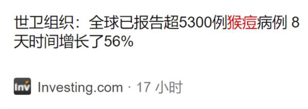 周一,盛传美国猴痘疫情存在失控风险,A股相关概念股大涨。当时媒体采信的全球猴痘疫情数据是超5000例。根据当时美疾控中心公布的数据,当时全球数据为:5783例!