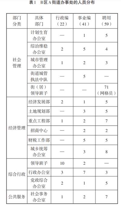 “影子雇员”在基层政府的部门分布有一些共同规律,下文将以中部某省B区A街道为例,对“影子雇员”的部门分布进行分析。该街道有行政编22个,事业编41个“,影子雇员”包括59名聘用人员和71名网格员(见表1)。