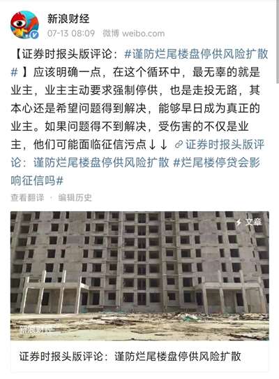 昨天,一则媒体评论在发布后瞬间冲上了各大社交媒体的热搜,标题是《谨防烂尾楼盘停供风险扩散》。