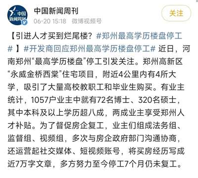 2022年6月,已经在网上流传了几个月的传闻终于被顶上热搜,“郑州学历最高楼盘烂尾”,一时间引发无数讨论:连引进人才的楼盘都烂尾了?