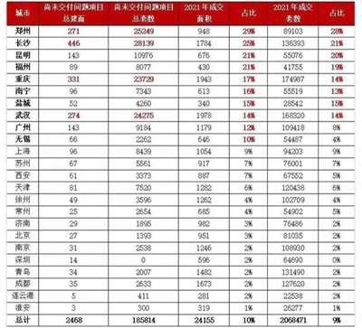 其中郑州、长沙、重庆和武汉尚未交付的问题项目总建面皆超200万平方米、总套数皆超2万套。
