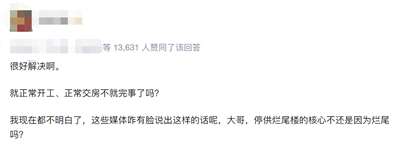 这事要解决,其实也不难。正如新闻下点赞最多的评论所说,“就正常开工、正常交房不就完事了吗?”