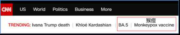 7月14日,美CNN将猴痘与奥密克戎最新主流变异株BA.5并列,同步开设热点专栏。而BA.5目前已经是美欧以及世界第七波疫情的主流,美国近期新冠病例日增11万+,BA.5占比超三分之二。