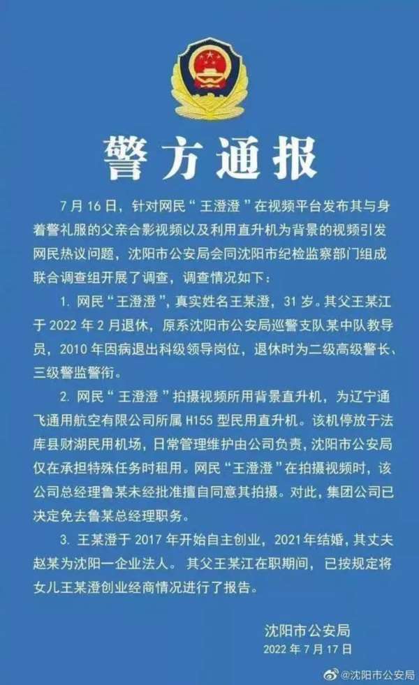 【导读】上周末,一个名叫“王澄澄”的女网红登上热搜。据媒体报道,她生活在沈阳,22岁创业四年就坐拥400平方米豪宅以及豪车,穿戴都是奢侈品。而真正将她推上风口浪尖的,是她与身着警服的父亲合影及租借印有“辽宁”字样的直升机拍摄短视频。后续沈阳市公安局发布通报称,视频中的直升机为民用,沈阳市公安局仅在承担特殊任务时租用,目前“王澄澄”账号内容已不可见。