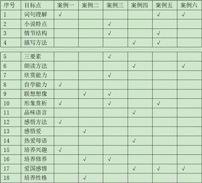 从统计表可以看出,除了“词句理解”、“形象赏析”和“(培养)爱国感情”,各有三个案例的目标点重合,“情节结构”“描写方法”“朗读方法”“联想想像”“培养修养”等5个案例的目标点有两个重合之外,其它10个目标点都只有一个,目标点互不一样。由此可见,即使讲授同一篇课文,其教学目标设计也有很大的差异。