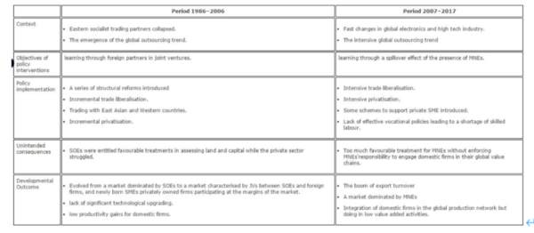 作者基于对电子工业从业者和利益相关者的采访,以2006年为分界线,分析指出:越南政府本想通过投资奖励,来吸引外国投资者,并想借助外国直接投资带来的技术溢出,推动本土制造业的发展与技术升级。但是这一政策并未奏效,越南本土企业并未获得真正的技术进步与创新,原因在于贸易自由化和经济激励政策固然重要,但对这些政策的依赖,导致跨国企业与本土企业发展失衡,出现大量寻租;而跨国企业并未履行向本土企业传播技术和管理的承诺。对此,越南政府也缺乏必要的政策框架来加以约束。长期而言,越南本土企业在这种竞争中只能日益衰败。