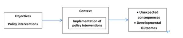 为了理解影响越南电子工业发展的各种因素,我们使用了新的分析框架(如图所示1),这一框架包括四个层面:(1)政策干预的目标;(2)背景;(3)政策干预的实施;(4)指导数据收集和分析的结果。我们还将结果区分为意外后果和发展结果。