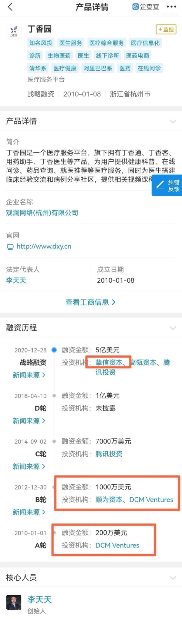 2010年,丁香园获得了美国超级资本巨头DCM的200万美元的投资,2012年再次收获DCM和顺为资本资本1500万美元的投资。