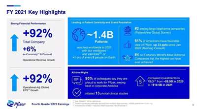 过去两年辉瑞在疫情下赚的盘满钵满啊,2021年实现营收813亿美元,同比大涨92%,新冠疫苗COMIRNATY带来367.8亿美元的收入。2022年,辉瑞在《财富》500强中的排名高达49名,公司的市值高达2803.76亿美元。