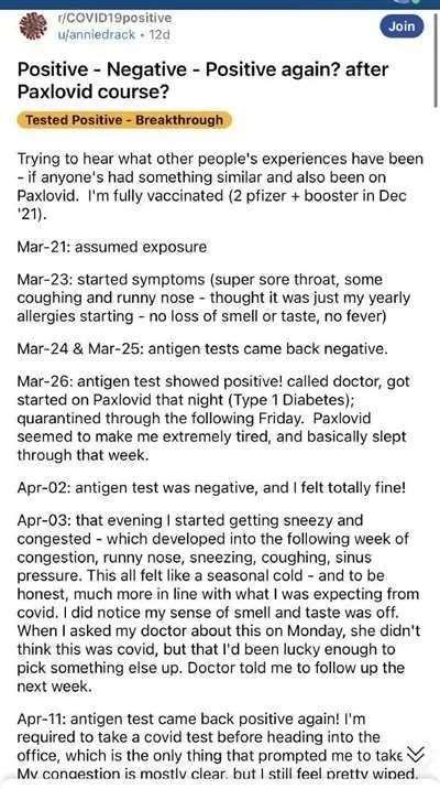 “吃了辉瑞新冠口服药Paxlovid一个疗程(5天)感觉很好、症状减轻,转阴。但是一旦停药,症状又回来了,又复阳了。”