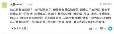 比如这一位。治疗期结束后,仍然有胃痛和疲劳,感觉很痛苦。而医生的说法更有意思,原来只要没有死亡危险,就是轻症——这轻症可与我们想象中类似普通感冒一样的轻症一点儿也不同啊。