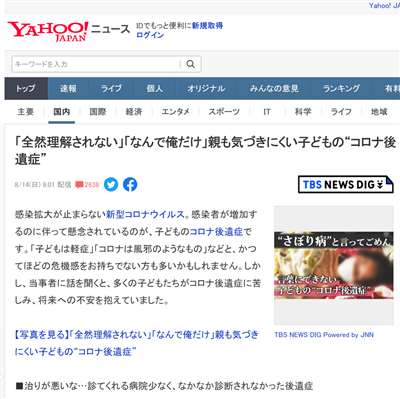 昨天,日本雅虎登了一篇TBS的新闻报道,题为《“完全不被理解”,“为什么只有我”,父母也很难察觉的孩子的“新.guan后遗症”》。
