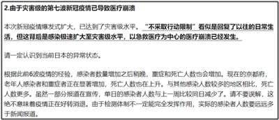 其中提到“在京都府的多家医院中,已反复发生集团感染,医务工作者因染疫需要离岗休息,这种情况每一家医院每天都有数十人到上百人不等。所有的医疗机构都在全力以赴拼命坚持,在京都府应对新冠疫情的病床床位实际上已经处于饱和状态,所有的医院都难以迅速收治患者。”