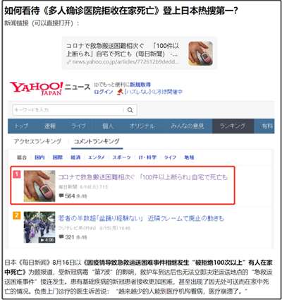 8月16日,日本因为疫情导致急救运送困难的事件发生了100次以上,有人在家中死亡,这个报道也直接上了日本热搜第一。